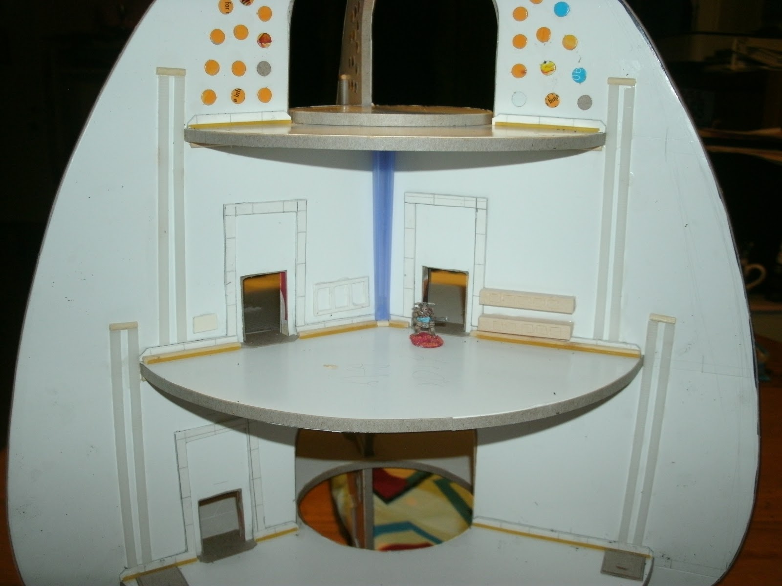 The start of rocket pods have been added to the bottom-most level as well. I've got a lot more pieces to add to these (tops of dishwater detergent bottles) to make them look more rockety (rocketish?), but those will have to wait until after the first paint job. In fact, this is one piece of terrain that is going to require careful planning. I've got a lot of ideas for furniture, but I can't put any furniture in until after I detail the walls and floors. Just like a real rocket.